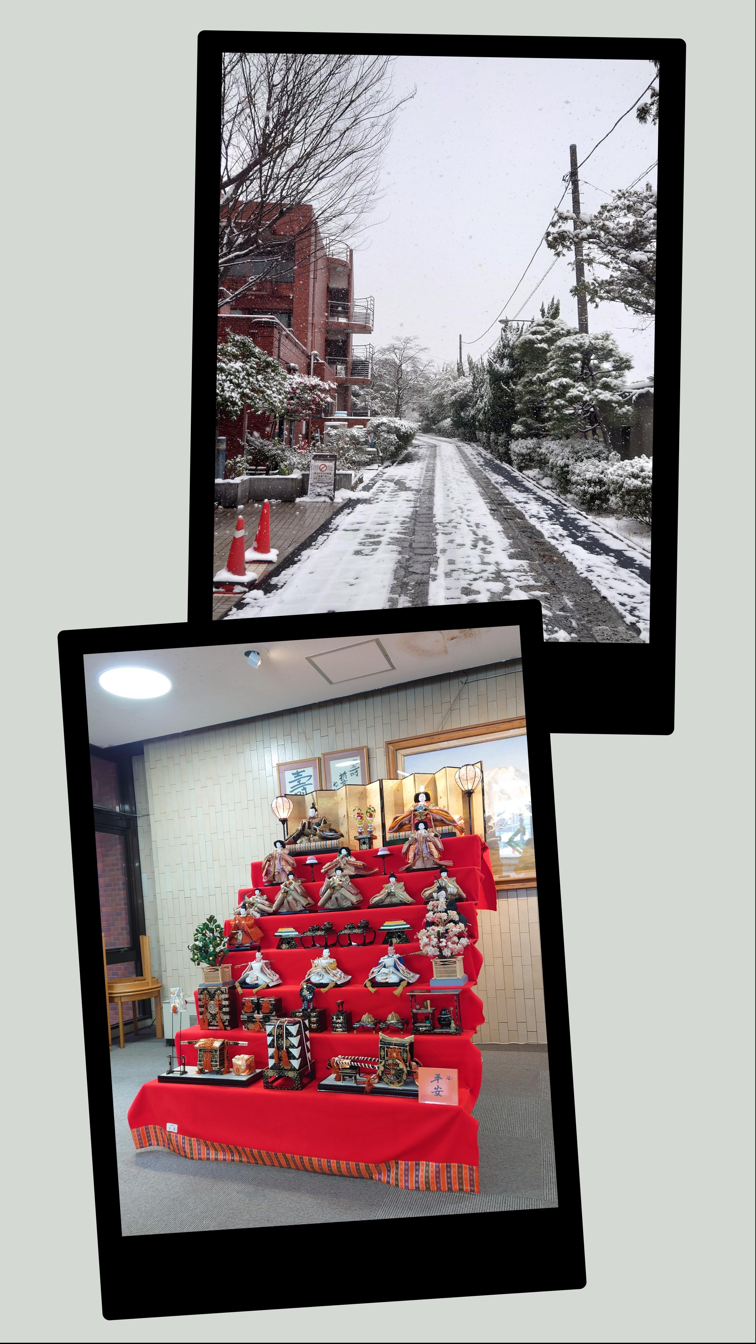 昨晩からの雪がうっすらと積もり敷地内も雪化粧となりました。 館内ロビーに本日雛飾りをいたし...