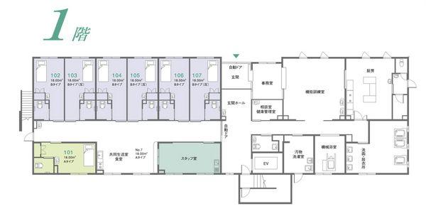 エントランスホール、リビングルーム、ダイニングルーム、テラス、駐車場、バイク置き場、駐輪場、寝台用エレベーター、食堂、一般浴室、個人用浴室、健康管理・相談室、スタッフルーム、リハビリ室、介護浴室、機械浴室、ナースコール、食品庫、厨房室、リネン室、汚物処理室、放送設備
