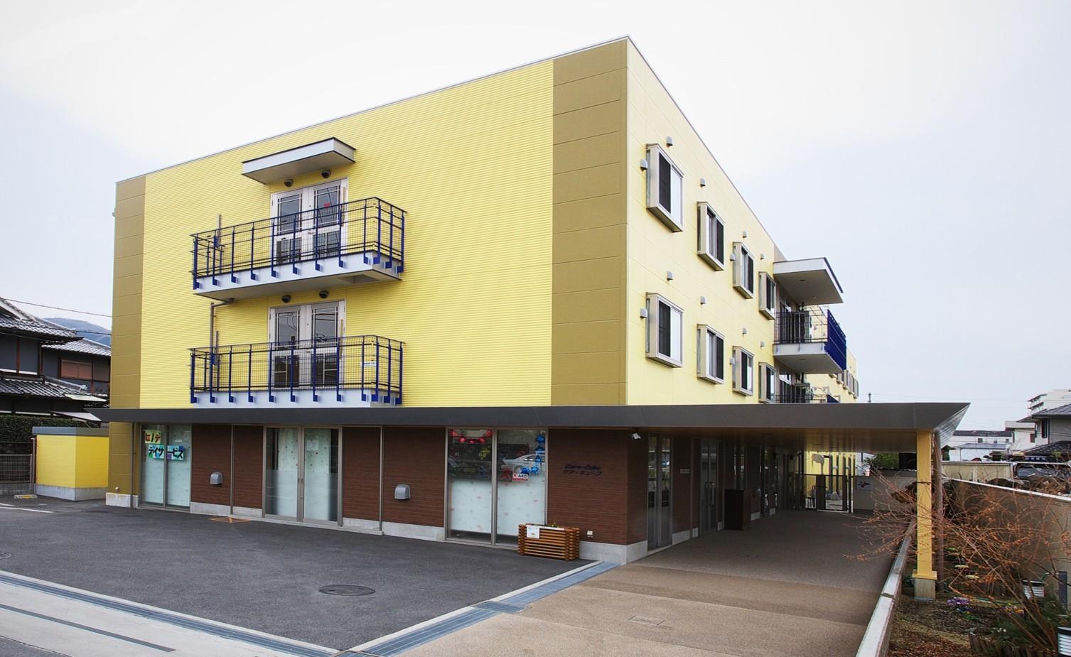 生駒山を望むロケーションに佇む「ケア・キューブくさか」。