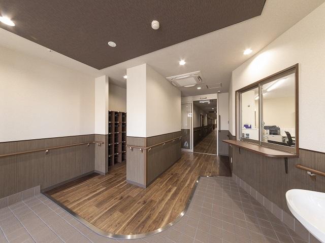 受付・玄関・相談室・エレベーター・スタッフルーム・健康管理室・多目的トイレ・浴室・機械浴室・厨房・食堂・談話室・テラス(物干)・洗濯室