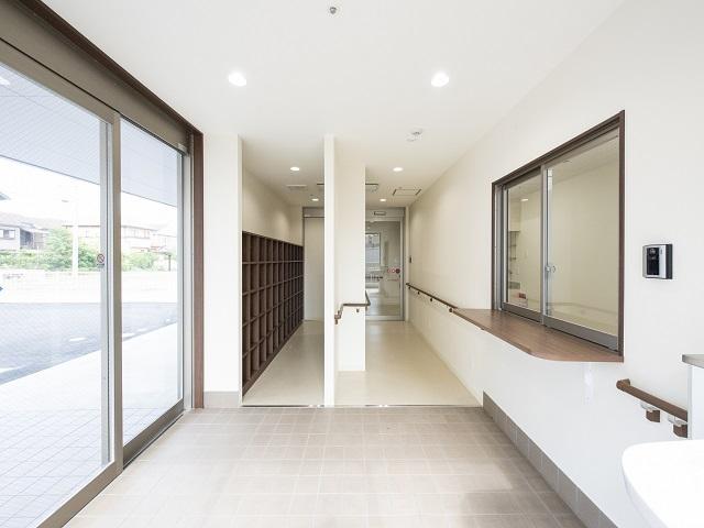自転車置き場・ポーチ・風除室・下足コーナー・事務室・更衣室・スタッフルーム・エレベーター・健康管理室・相談室・厨房・カウンター・食堂・脱衣室・浴室・機械浴室・多目的トイレ・2階屋根 物干しスペース
