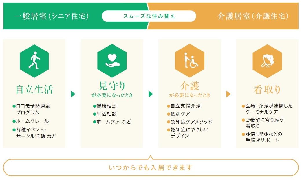 常時見守りが必要になったさいには、提携介護施設「ケアレジデンス」への移り住みをサポートしております。